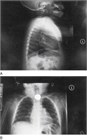 図73.1 胸部と頸部の後前方と側面をあわせたX線写真で上部食道の硬貨が見える.
