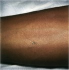 患者は尖った鉛筆の先端が皮膚に刺さったといって受診する.鉛筆の芯が残っているため,鉛中毒についての心配を口にする患者もいる.受傷部には黒鉛の刺青で覆われた小さな刺創が認められる(149.1).鉛筆の芯は,創内に残存して外部から視認できる場合もあれば,触知のみが可能な場合もあり,そもそも創内に残存していない場合もある.創部の触診時に皮下に残存した鉛筆の芯により異物感が生じることもある.