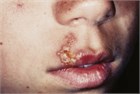 Patients present with swelling, burning, or soreness at the vermilion border of the lips followed by the appearance of clusters of small painful vesicles on an erythematous base (Fig. 54.1). The vesicles can rupture to produce red, irregular ulcerations with swollen borders and crusting, which eventually heal without leaving a scar. These lesions can also occur on the hard palate or gingiva. Episodes may recur after exposure to sunlight or emotional or physical stress. The initial episode is usually the worst, with generalized malaise, low-grade fever, tender cervical adenopathy, and occasional exudative pharyngitis lasting 2 to 3 weeks. Recurrences are milder and shorter, with a prodrome of itching or burning at the lesion site. The painful ulcers that eventually form last 7 to 10 days.