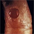 Often there is a history of a laceration or minor trauma to the skin or mucous membrane several days to a few weeks before presentation, but in most cases there is no apparent cause. The head, neck, and extremities are most commonly involved, especially the lips, oral mucosa, and fingers. An unsightly lesion forms, beginning as an extremely friable red or yellow papule or polyp, bleeding with every slight trauma. Objective findings usually include a crusted, sometimes purulent-appearing collection of erythematous, well-demarcated, red granulation tissue arising from a moist, sometimes hemorrhagic, skin ulceration, often with a collarette of scale at the base. There are usually no signs of a deep tissue infection (Fig. 178.1).